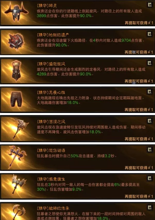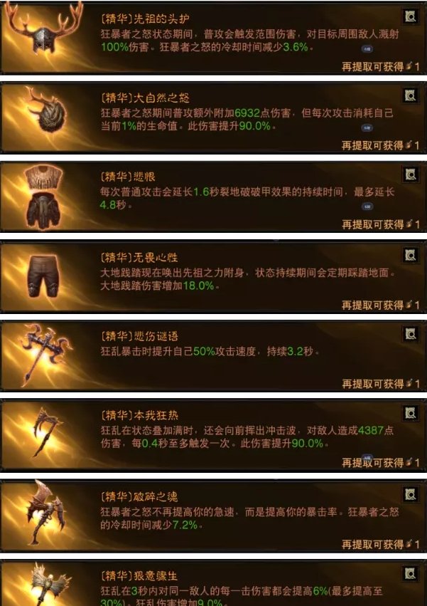 这套普攻流的单体爆发是最猛的,适合野蛮人打魔神,打副本秒BOSS,这是小编测试中非常意外的一套流派,是能在普攻上面和狂骑士拼一拼的打法。我们可以看到主副手4件加上护肩和头部全部强化普攻,增伤、攻速、暴击、叠伤害、附加伤害把普攻能涉及到的增益都拉满了,剩余精华是衣服悲恨搭配普攻给裂地破持续破甲,这个技能先手还是很不错的,再加上裤子无畏心性一个BUFF,相对来说其他技能没得到什么明显增益。
