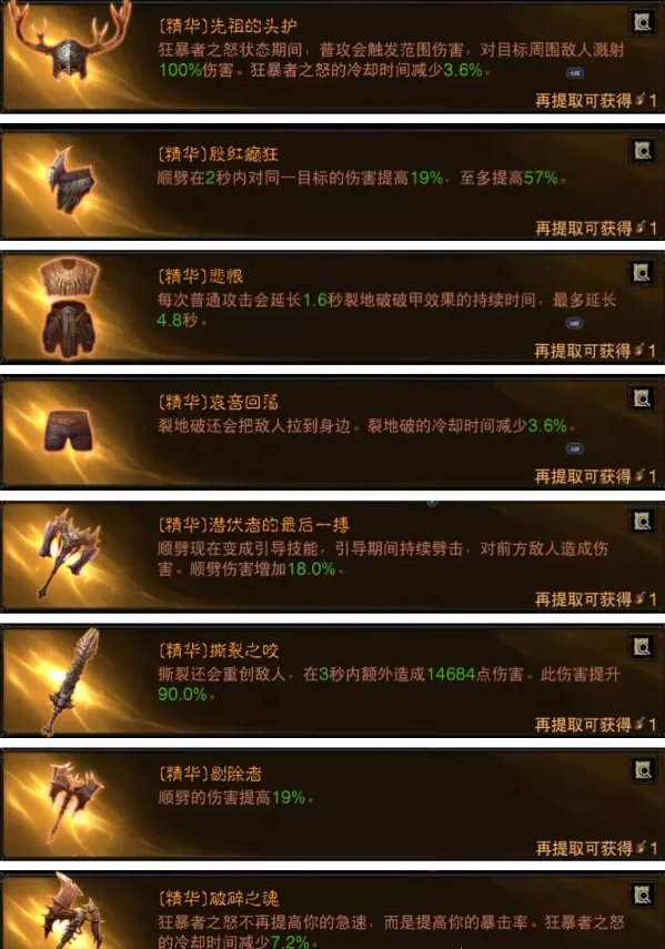 顺劈流因为占用了很多主副手精华,所以普攻狂乱的增益并不完全,所以首先改变了普攻的技能形态,放弃狂乱改成撕裂。这套的核心顺劈用了3个精华,护肩增加顺劈伤害,副手顺劈增伤,主手选择了潜伏者的最后一搏让顺劈变成引导技能爆发很高。裤子衣服精华都给了新技能地裂破,起手开地裂破降低敌人护甲给我方增伤再搭配裤子把敌人拉到我们身边开顺劈是一套不错的技能连击,(保留疾奔的前提下)这套只能放弃旋风击,如果选择了旋风击你会发现裤子和衣服的精华怎么带都不舒服。