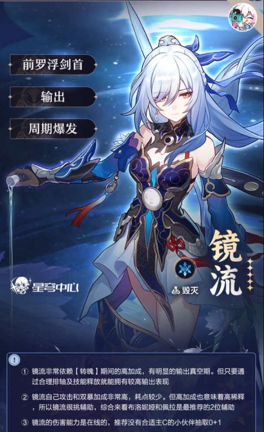 镜流的输出能力与饮月相当,属于目前非常强力的C位,队友方面最好是有布洛妮娅和佩拉,其中布洛妮娅可用停云替代。总之,非常适合目前急需强力C位的玩家抽取。