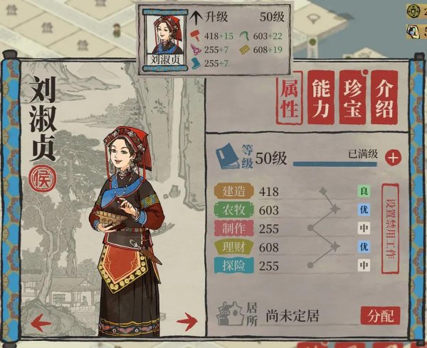 满级属性:建造418,农牧603,制作255,理财608,探险255