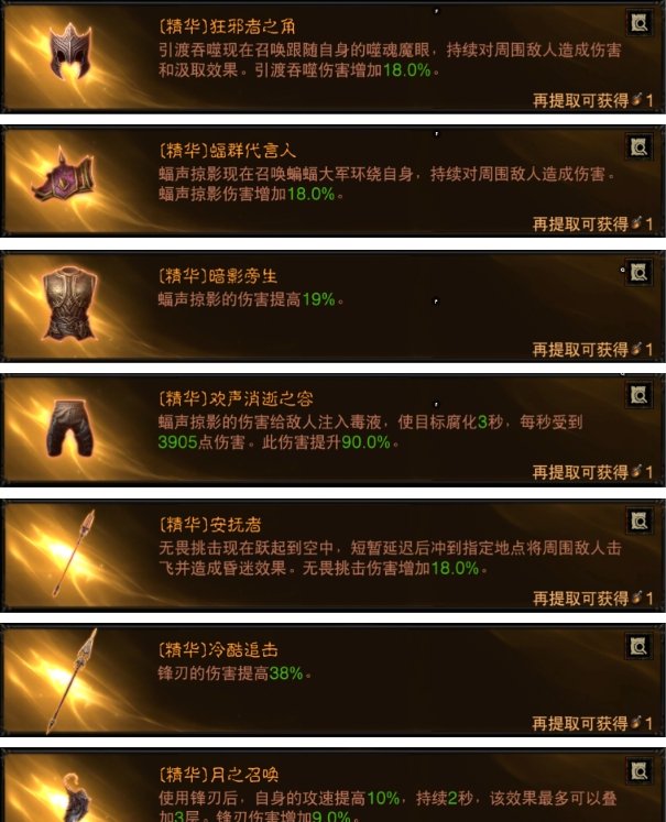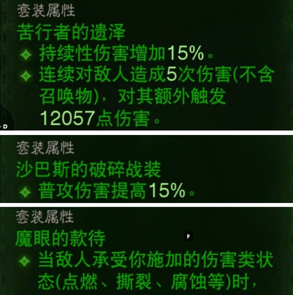 4苦行+2魔眼或2沙巴斯,4苦行的优先级是最高的,因为引渡吞噬和蝠群大军都是持续性伤害,其中裤子欢声消逝之容的蝙蝠腐化效果也是持续性伤害,这样2魔眼也同样收益,但蝠群代言人这个精华只有5秒持续时间做不到魔眼全程覆盖,所以带2沙巴斯也是可以的。