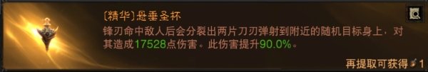 悬垂圣杯的收益不稳定,主要是打一个分裂小AOE效果,在初期没有精华选择的时候这个效果确实没得挑,但现在相比新精华就没有竞争地位了。