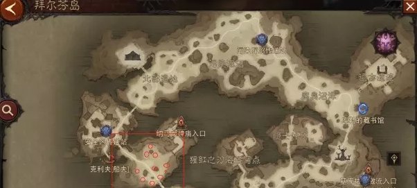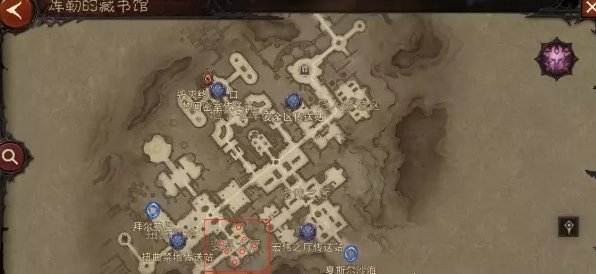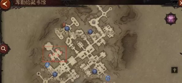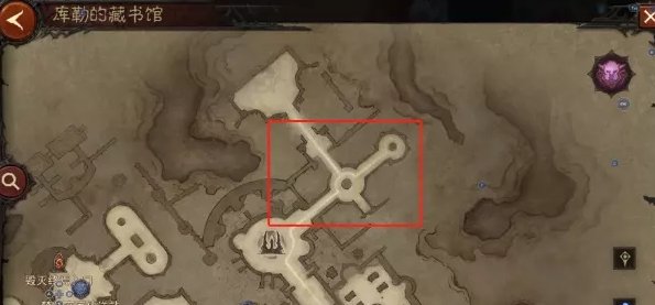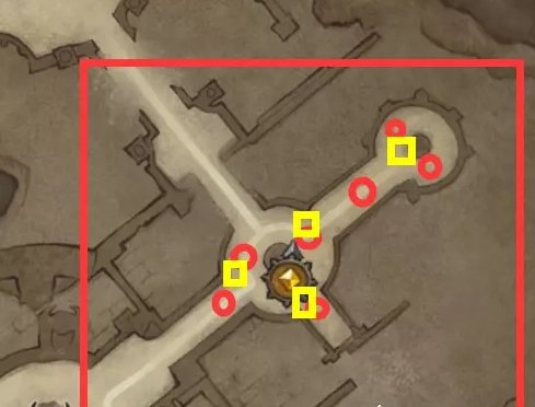 这是库勒的藏书馆中石像打野点,因为地点在石像下方故而得名,这里的好处是哥布林没有地方逃,而且出材料很丰厚,是相对冷门但又物资丰厚的一个优质打野点。图中红色圈圈是刷怪点,黄色方格是站位点。