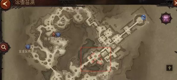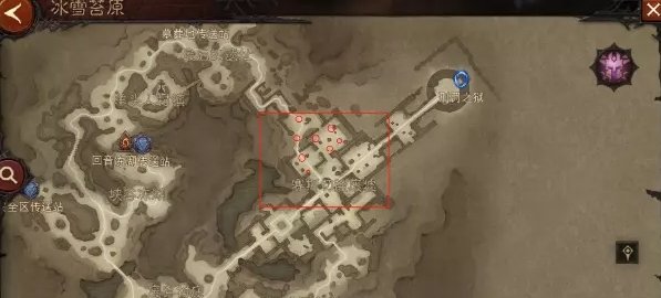 雪山中心算是雪山地图的经典,这个打野点分外面平原和里面一个大房间,大房间最好能组一个死灵在里面站点就足够全部打掉了。注意小幽标记的小圈圈是很多小虫子,同样是一波刷新点,不要漏了。