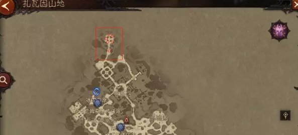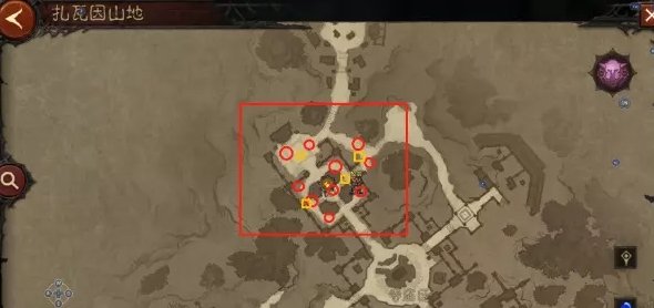 扎瓦因山地的山脚下打野点也是比较不错但很多玩家不知道的打野点,我们可以看出红色圈圈代表打野刷新点,在中心的四方格里会刷很多怪,这里需要2个玩家站点,其次四方格的左上方和右上方都有两波野怪需要人去打。
