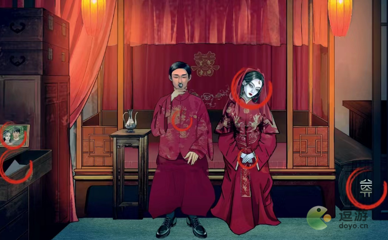 3、然后在洞房场景,点击左边的照片、惨白双手、右边的棺材