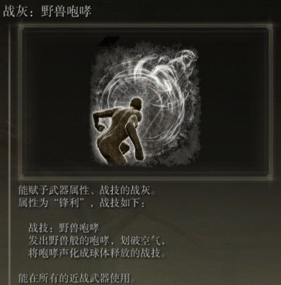 战灰属性:厚重 需要武器:剑、斧、锤(不包含小型武器、刺剑)这里我强烈建议使用直剑或者阔剑附加狮子斩战技,大剑、斧子、锤子释放起来总感觉不如直剑阔剑的效果好。