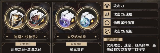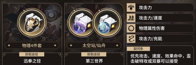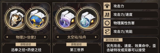 而击破特攻目前来看暂时没有专门去堆的必要,因为目前的环境完全没有纯物理弱点的环境,特意堆击破特攻的话伤害浮动过大,游戏体验有会跟着环境仅需大幅波动;而带银狼时又会因为3/4色队的关系导致弱点非常容易挂歪,有可能迟迟不出物理弱点,因此遗器的词条选择建议以堆常规加成为主,将击破作为附加奖励即可。