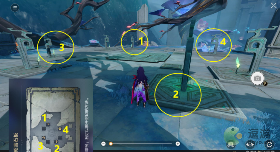 3、第3处解密顺序,先打了这里中间的怪后,【调查】中间位置获得解密提示石板,按照石板顺序,依次【触碰】即可完成该处解密