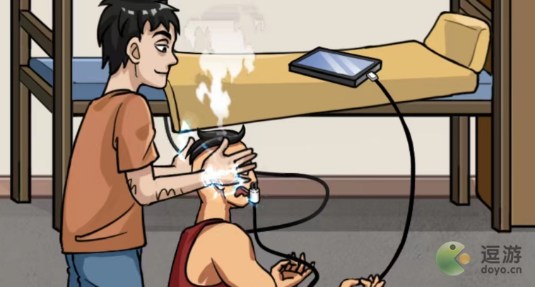 4、点击下铺男生,然后拖动物品栏的充电器到打坐男身上,再搓动打坐男的头,成功发电