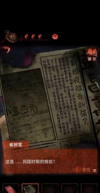 5、拿到新娘木偶之后,就可以把木偶挂在无子却叫娘的灯笼上,就可以完成其中的谜题,获得报纸,获得打开花轿盒子的后面的三个密码。